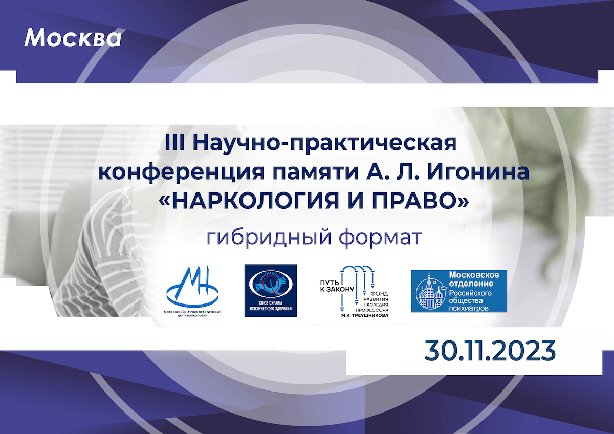 Завершена работа III Научно-практической конференции памяти А. Л. Игонина «Наркология и право», которая стала платформой для обсуждения вопросов нормативно — правового обеспечения и регулирования оказания наркологической помощи на междисциплинарной основе для повышения качества лечебно-профилактической, медико-социальной и правовой помощи людям, страдающим от наркологических заболеваний. Также был проведен анализ актуальной наркологической ситуации; обозначены проблемы, требующие новых подходов к организации всех форм профилактики наркотизации, к повышению эффективности лечебно-реабилитационного процесса, а также развитию реабилитационного потенциала на базе диспансерных и стационарных учреждений с опорой на общество. В конференции приняли участие более 700 психиатров, наркологов, психотерапевтов, психологов, юристов России и Белоруссии.